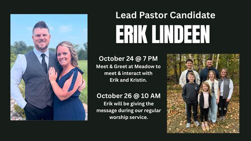 And then on Sunday, October 26, Erik will deliver the message during our regular worship time followed by informal time after service to meet Erik & his family. You also are encouraged to provide any feedback on Erik (comments left in the boxes at back of auditorium). The Elder board will consider this feedback as we continue to seek God’s will for leadership at Meadow Spring.